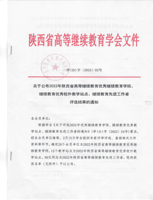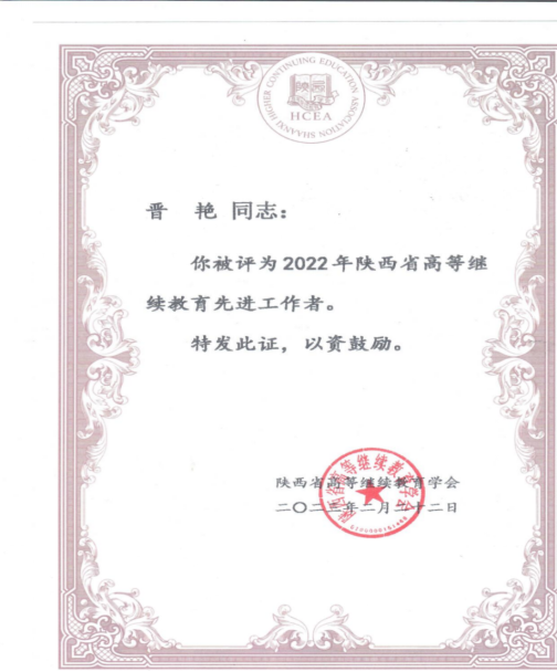 近日,陕西省高等继续教育学会下发了“关于公布2022年陕西省高等继续教育优秀小说色情 、继续教育优秀校外教学站点、继续教育先进工作者评选结果的通知”,经陕西省高等教育学会组织专家评审评选,小说色情 晋艳同志被评为陕西省高等继续教育先进工作者。