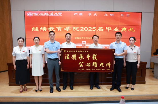 饮水思源,不忘来路。2023级毕业生为学院精心准备了一块写有“法韻承千载,公心耀九州”的牌匾。无声的牌匾诉说着毕业生们对学院、对母校的拳拳之心。李集合、王国庆代表学院接受牌匾。