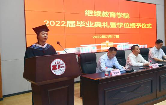 2020级毕业生、优秀函授生寇江勇同学发言。表示大学的学习生活将成为每一名同学前行的不竭动力,承载着各自的理想和希冀,更加勇敢、坚强、自信地面对未来。