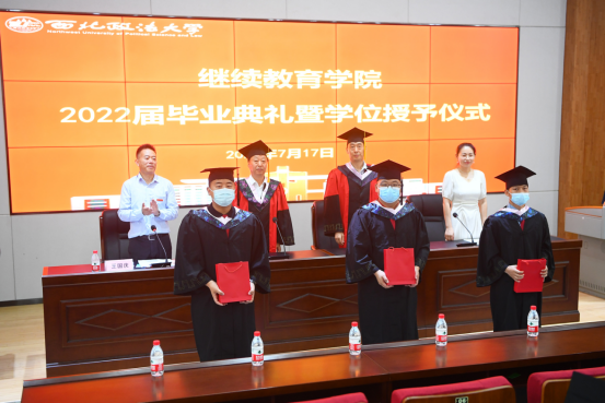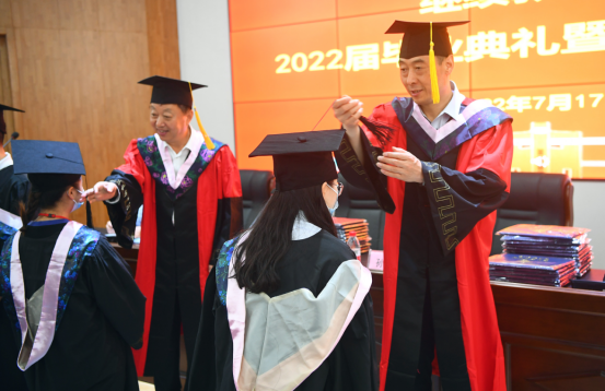 毕业典礼结束后,进行学位授予仪式,由导师为获得学士学位每一名参加学位授予仪式的毕业生、自考生颁发学位证书,拨穗正冠并合影留念。