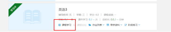 四、在主页面【学习中的课程】中选择本次开设的网课(以教学科通知的为准),点击【课程学习】,然后再点击播放视频进行学习。如图所示:
